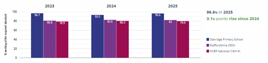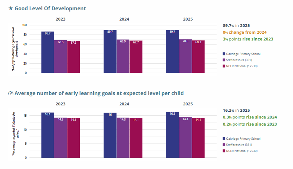 Attainment at the end of the Foundation Stage: 89.7% of the children achieving a GLD which is 21.4% above 2025 national (68.3%).