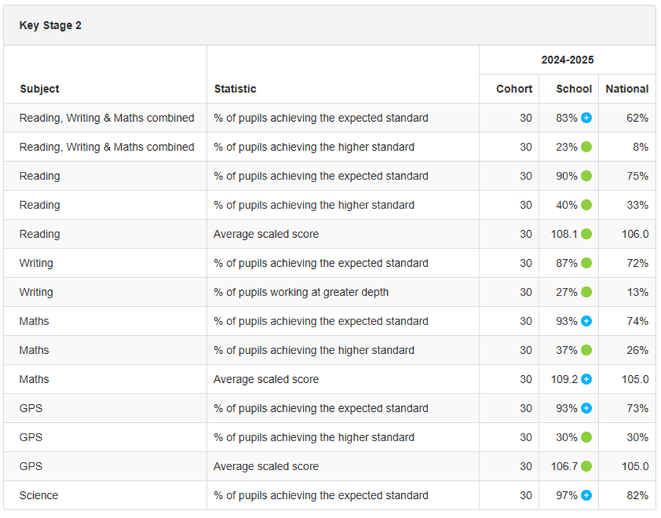Analysis at the end of the Foundation Stage, KS1 and KS2 shows that over time the 3 year attainment averages against National Expectations and GDS / HS continues to be outstanding and in many areas is significantly above National.